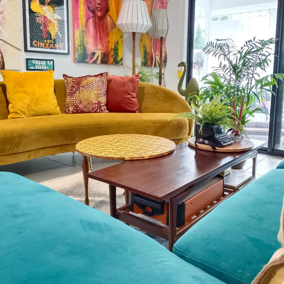 Super cute round retro coffee table updated in mustard with brown star stencil application. The top is sealed for durablity and longevity and the legs painted and waxed.