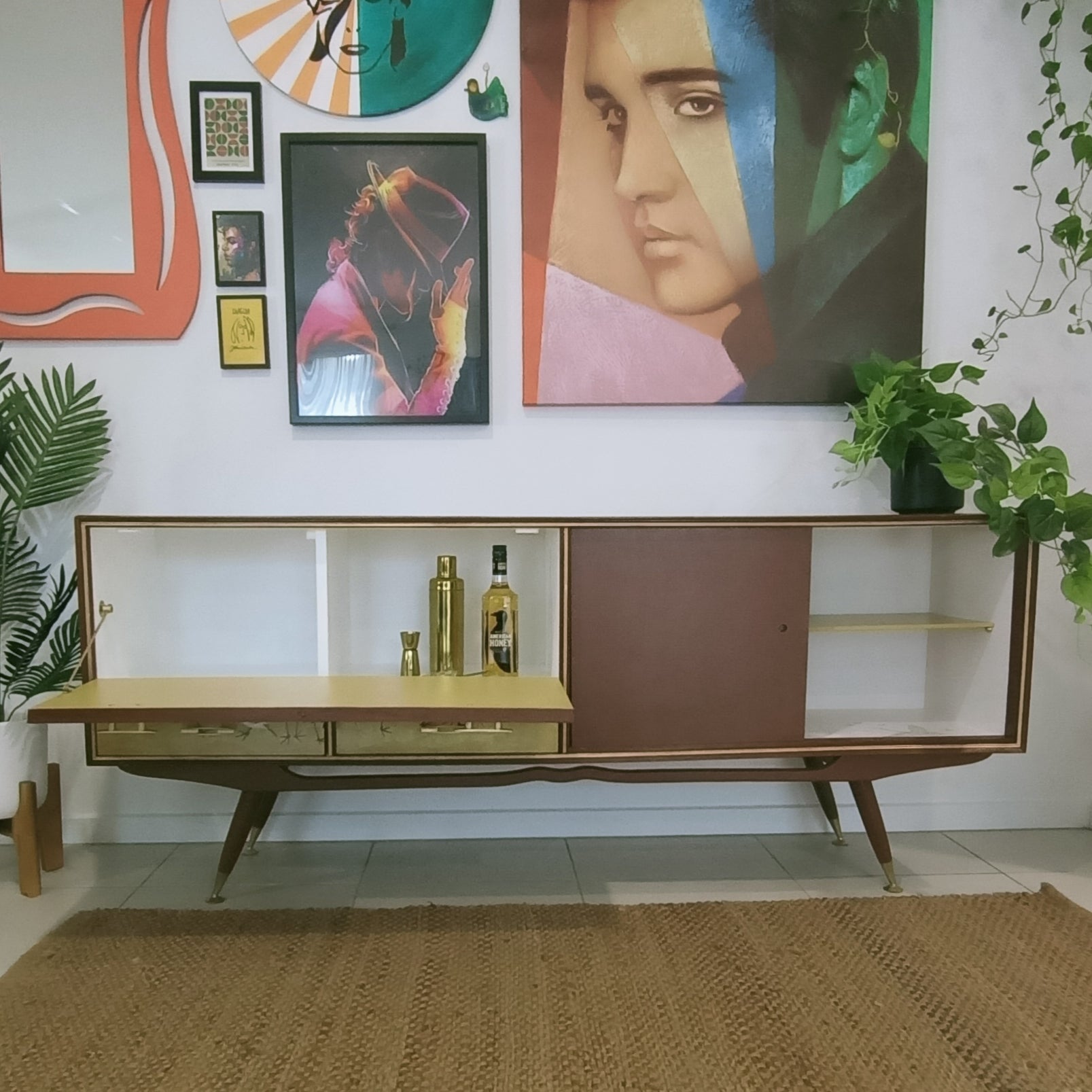 A definite statement retro mid century sideboard with a gorgeous heron accent surrounded by a deep rich brown paint to highlight this beautiful decoupage.