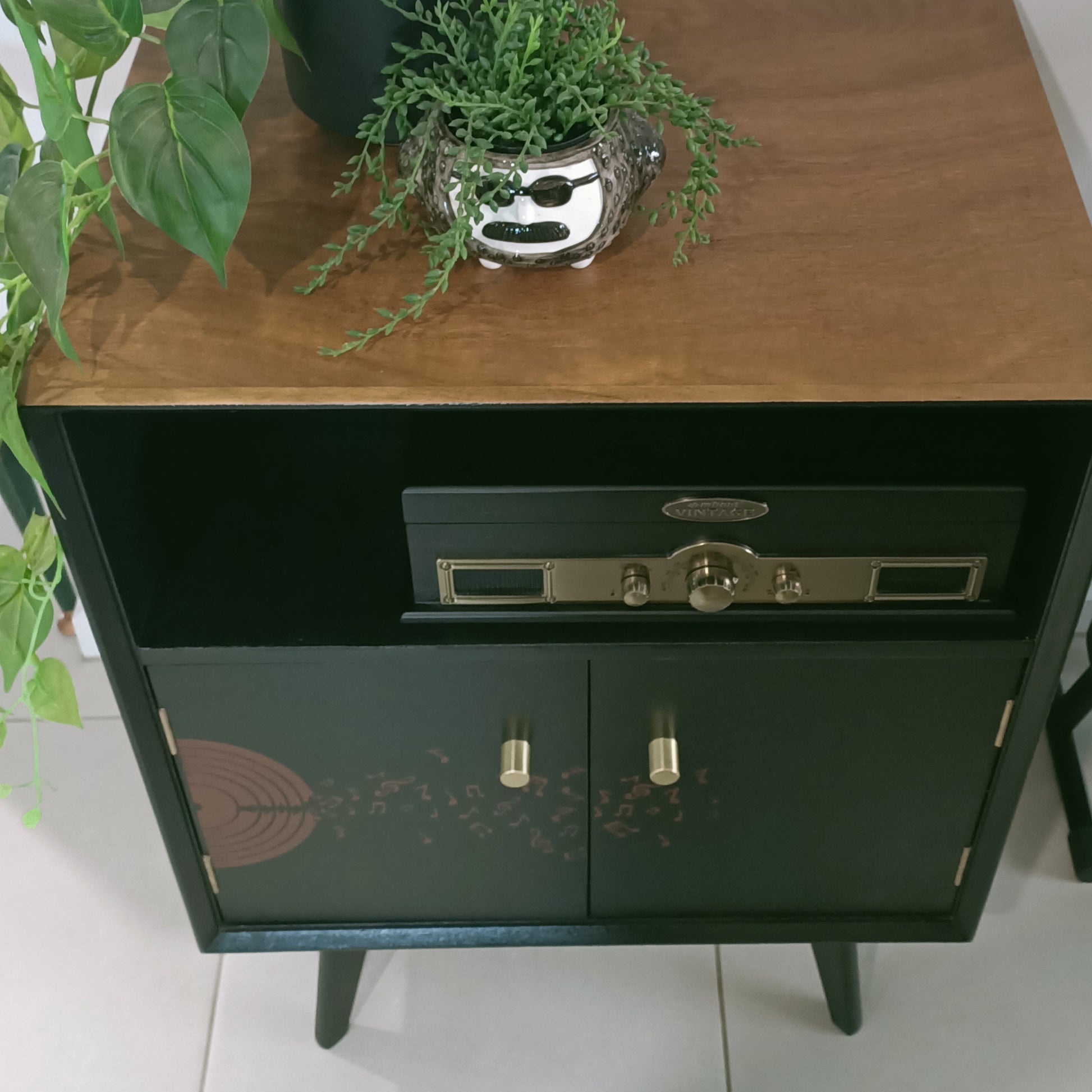 This vintage mid century record cabinet has been jazzed up with a modern update in sleek black, funky retro music stencil to the front cupboards and these gorgeous gold handles for a subtle and modern update. A great height and a non-intrusive length, this could be a statement staple for any music lover and their collection.
